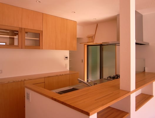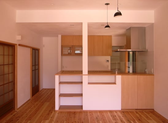 台所、居間、応接室をLDKとし日中照明が必要だったが南面からの採光を取り込むことで解消。