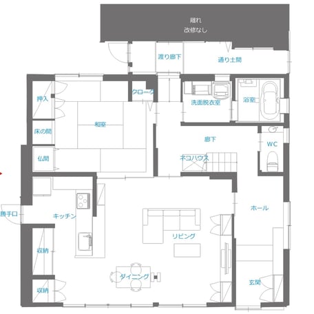 ・現在の新築住宅に見られるような、現代的なライフスタイルの間取りになっている。住まい手の暮らしが大きく変わることが間取りからイメージできる。