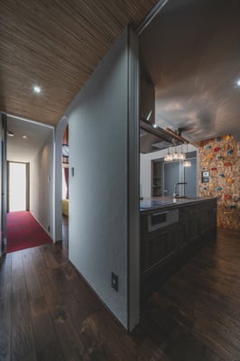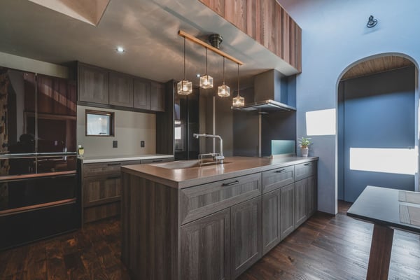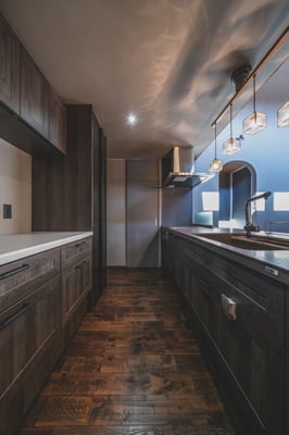 キッチンを回遊できる間取りで行き止まりのない動線にし動線上には収納を設置