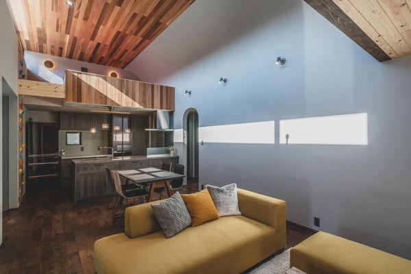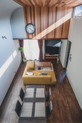 吹抜けのあるリビングは高窓から光が射し込み心地いい空間に