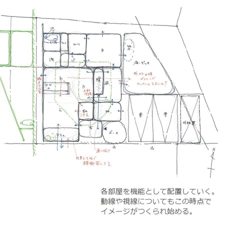 玄関、LDK、寝室、子ども部屋、水廻りなどの部屋を単純な機能として見なします。 読み取った敷地の特性を活かして、敷地の中でここにこういう機能があると気持ちがいい、ここにはこの機能を持ってくると便利がいい、というふうに、具体的な間取りを考える前に各機能のレイアウトをおおまかに決めていきます。